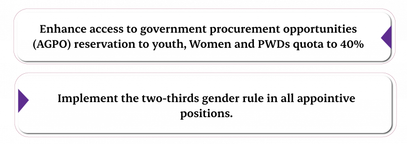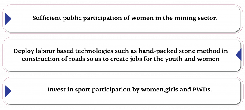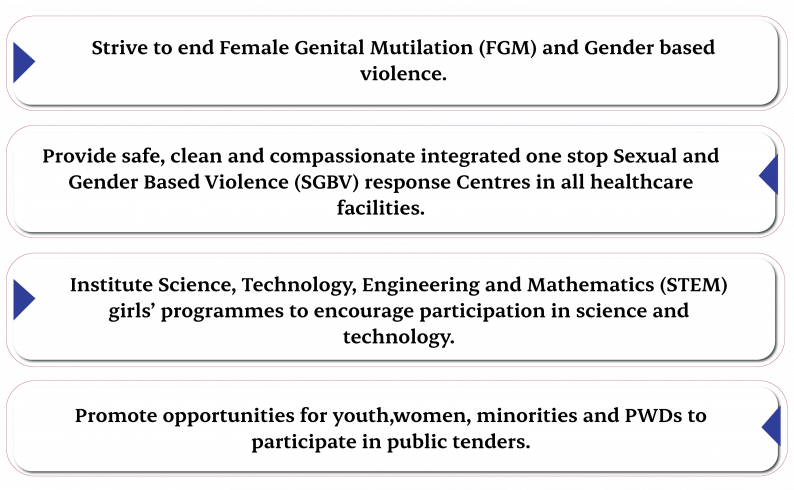 Further, parties have promised to implement the two-thirds gender rule in elective and appointive positions, improve access to funding, provide quality healthcare, address gender based violence (GBV), and revisit the questions of equitable distribution of land and other resources, among other issues.