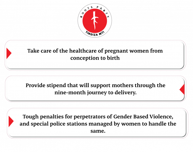 The Roots Party 10-point manifesto does not mention any pledges to women, however, Roots’ party leader Professor George Wajackoyah has in interviews with the media, highlighted his plans for women which are centred on caring for pregnant women.