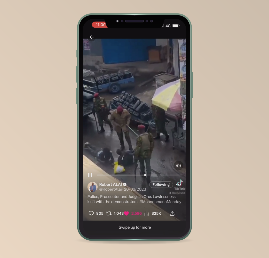 But even before the DCI was investigated online (they’ve since apologised), a horrific video that showed policemen with batons violently beating two people on the ground was circulating. One person who refused to lie down took the brunt of it from the General Service Unit officers in their trademark maroon berets. Robert Alai, who is an elected Member of County Assembly in Nairobi, shared the video with a tweet. “Police, Prosecutor and Judge in One. Lawlessness isn’t with the demonstrators #MaandamanoMonday,” Alai wrote.