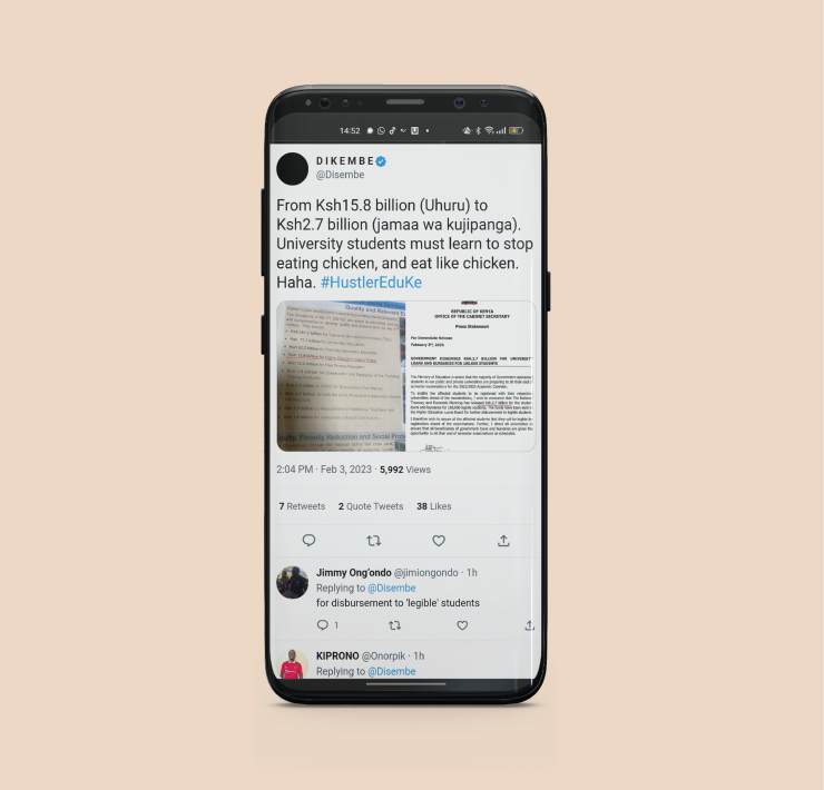 A video being shared on TikTok shows a convoy of motor vehicles moving past a crowd of people. The crowd is chanting “William Ruto” and “UDA”.
