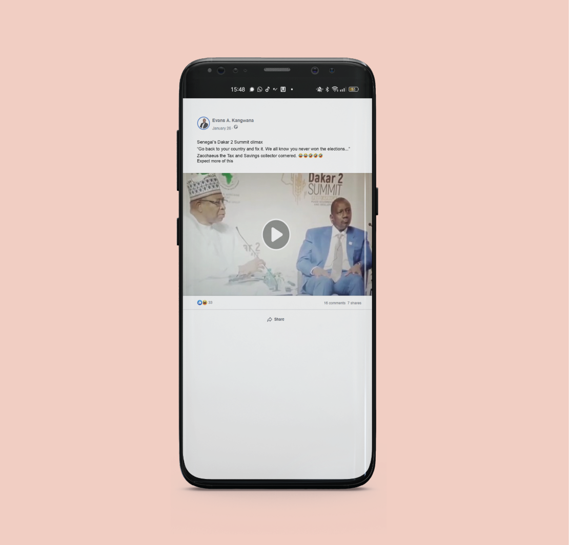 The video shows Kenya’s President sitting silently as a man sitting next to him dressed in white criticizes him.
